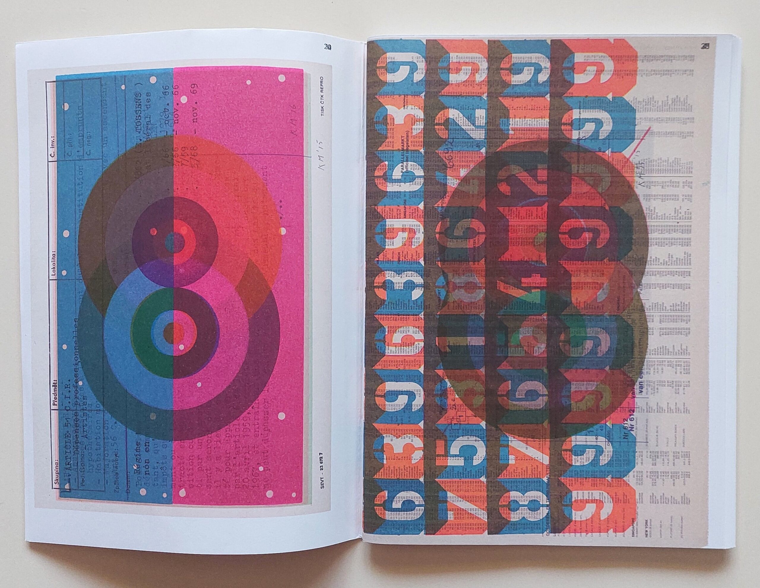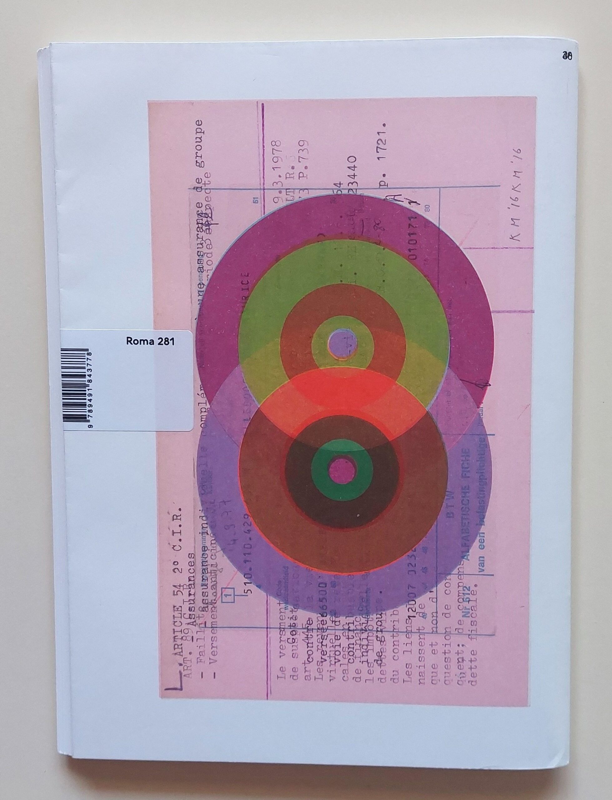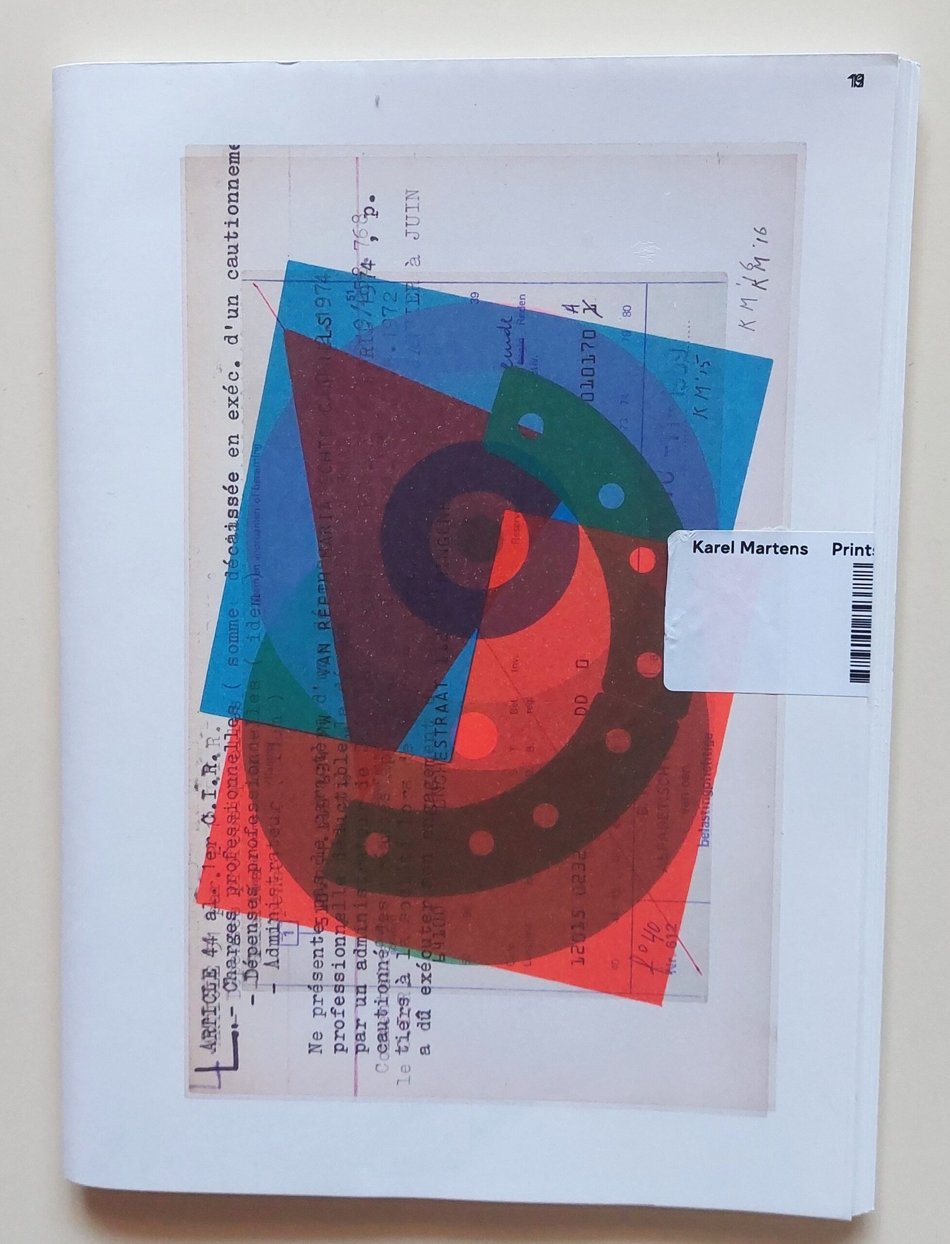 Stitched, illustrated wrappers. Artist’s book illustrated with color letterpress monoprints. The monoprints were made by Karel Martens between 2014 and 2016, reproduced at actual size (except for two ‘numbers’ prints). It is available in two different cover versions which is the result of a printing experiment by printing all the content of the book in 3 layers on one print sheet, which was cut and folded into two different covers. 48 pp. 24 x 17 cm.